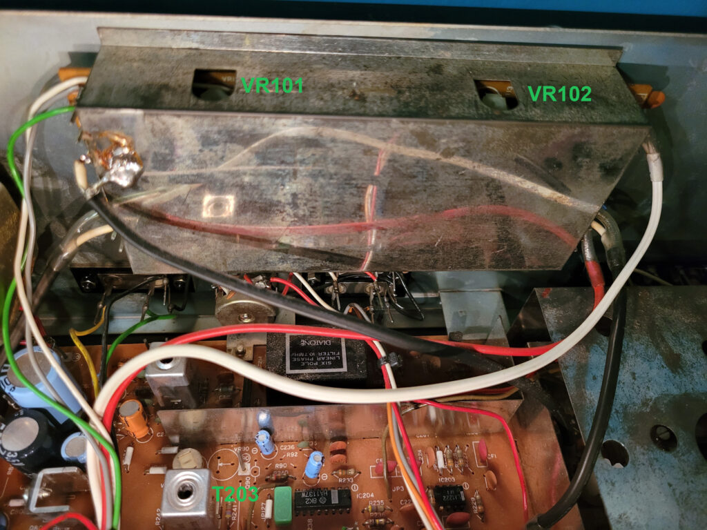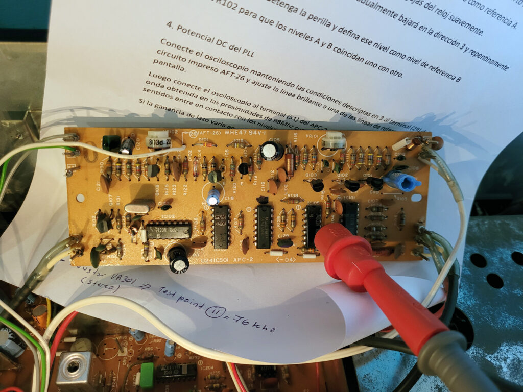 Con este divisor funcionando el PLL cobra vida, los pulsos de muestreo aparecen y la sintonía muestra síntomas de engancharse, sin embargo, aquí hay dos presets (VR101 y VR102) que ajustan tanto el nivel de la muestra como la ganancia del lazo que deben ser considerados para una correcta operación. Según el manual de servicio, en teoría, con un osciloscopio y un generador de RF debería ser muy simple. Pero recordemos que, en teoría, el comunismo funciona. La realidad fue bastante más difícil, no está tan claro en el manual el procedimiento y para peor el ajuste es bastante crítico y sensible por lo que me llevó varios intentos, pruebas y errores dejar bien ajustado el PLL.