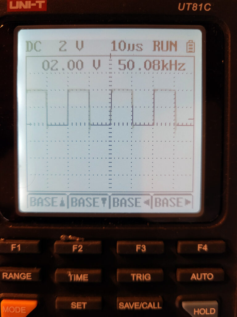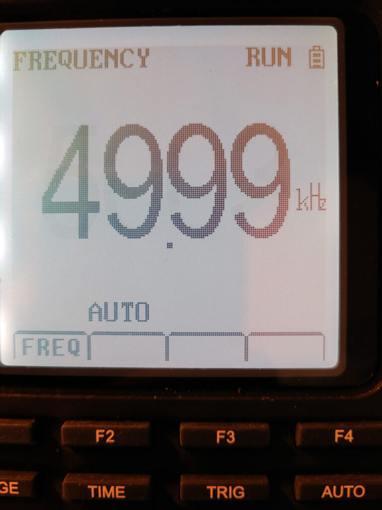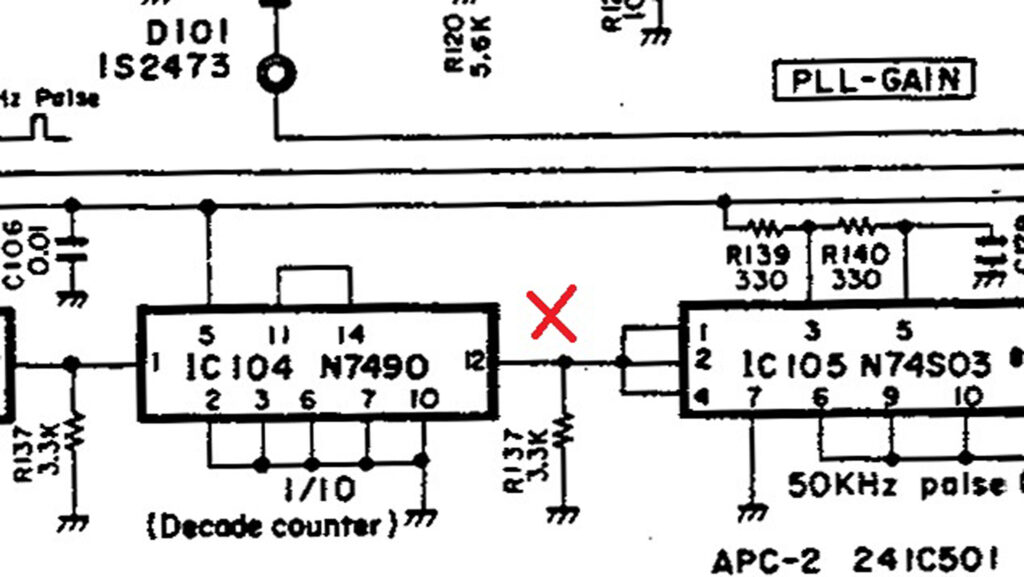 Yendo al detalle del PLL del Mitsubishi, nos encontramos con un oscilador de cristal de cuarzo, muy estable a 10Mhz, luego pasa por una primera etapa de división TTL por 2 (SN7493), con lo cual a su salida deberíamos tener una señal cuadrada con niveles TTL de 5Mhz, luego pasa a un divisor (SN7490) por 10, con lo cual deberíamos tener una señal cuadrada de 500Khz, pasa a otra etapa de división por 10, un segundo SN7490 y en su salida “debería” haber 50Khz, para luego atacar a un TTL rápido (SN74S03, 4 puertas NAND Schottky) configurado como conformador de pulsos, generando pulsos de 40 nS (nano segundos) de duración a una frecuencia de 50Khz.