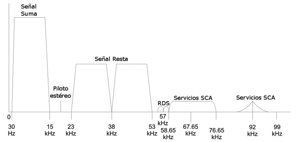 Aquí podemos ver que desde 30Hz a 15Khz está contenida la información de la suma de ambos canales de audio (I+D), lo que posibilita que un receptor mono que no cuente con este sistema pueda demodular sin problema la señal. A los 19Khz aparece la subportadora, la encargada de sincronizar el decodificador y la indicadora de la presencia de señal estéreo. Desde 23Khz a 53Khz aparece una señal modulada en DBL (doble banda lateral) con portadora suprimida, es como si fuese un AM con portadora en 38Khz, pero la misma ha sido suprimida. La información es la resta de ambos canales (I-D), por lo tanto, con los 19Khz y con esta información (I+D, I-D) se puede rescatar por separado los canales izquierdo y derechos. Lo que aparece después en el espectro puede o no estar y es información como la otorgada por el sistema RDS que no es relevante para esta nota.