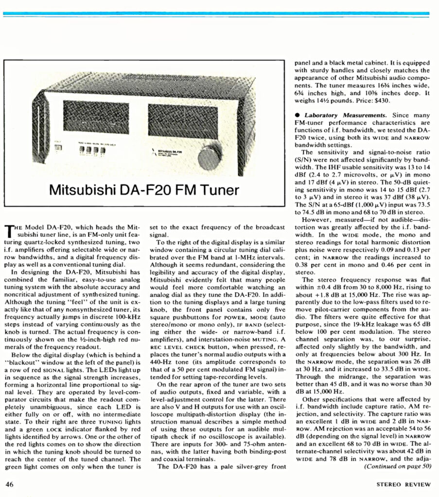 Sin embargo, y haciendo honor de que el éxito es esquivo a los cobardes, Mitsubishi, pone en 1979 toda la tecnología y conocimiento disponibles para hacer uno de los 10 mejores sintonizadores de FM que han existido (HI-FI Stereo Review 1979), y, a la vez, uno de los diseños electrónicos más exquisitos que he tenido la oportunidad de operar. Con ustedes… “El Mitsubishi DA-F20”