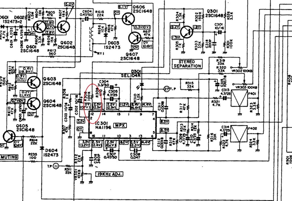Por los síntomas evidenciados no caben dudas que el integrado encargado de la decodificación MPX (IC301 HA1196) está conmutando o tiene dificultades para sincronizar la señal de 19Khz.
